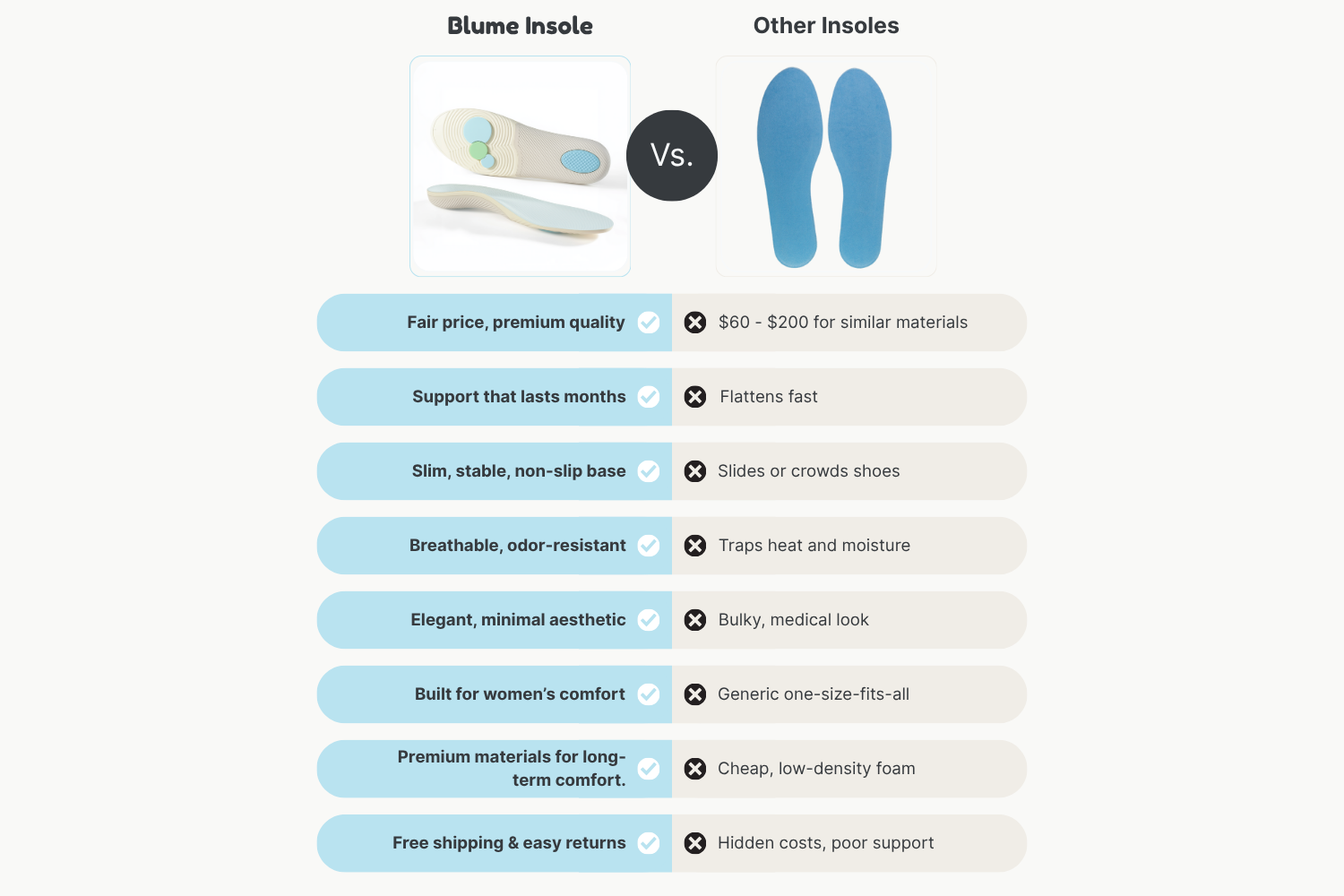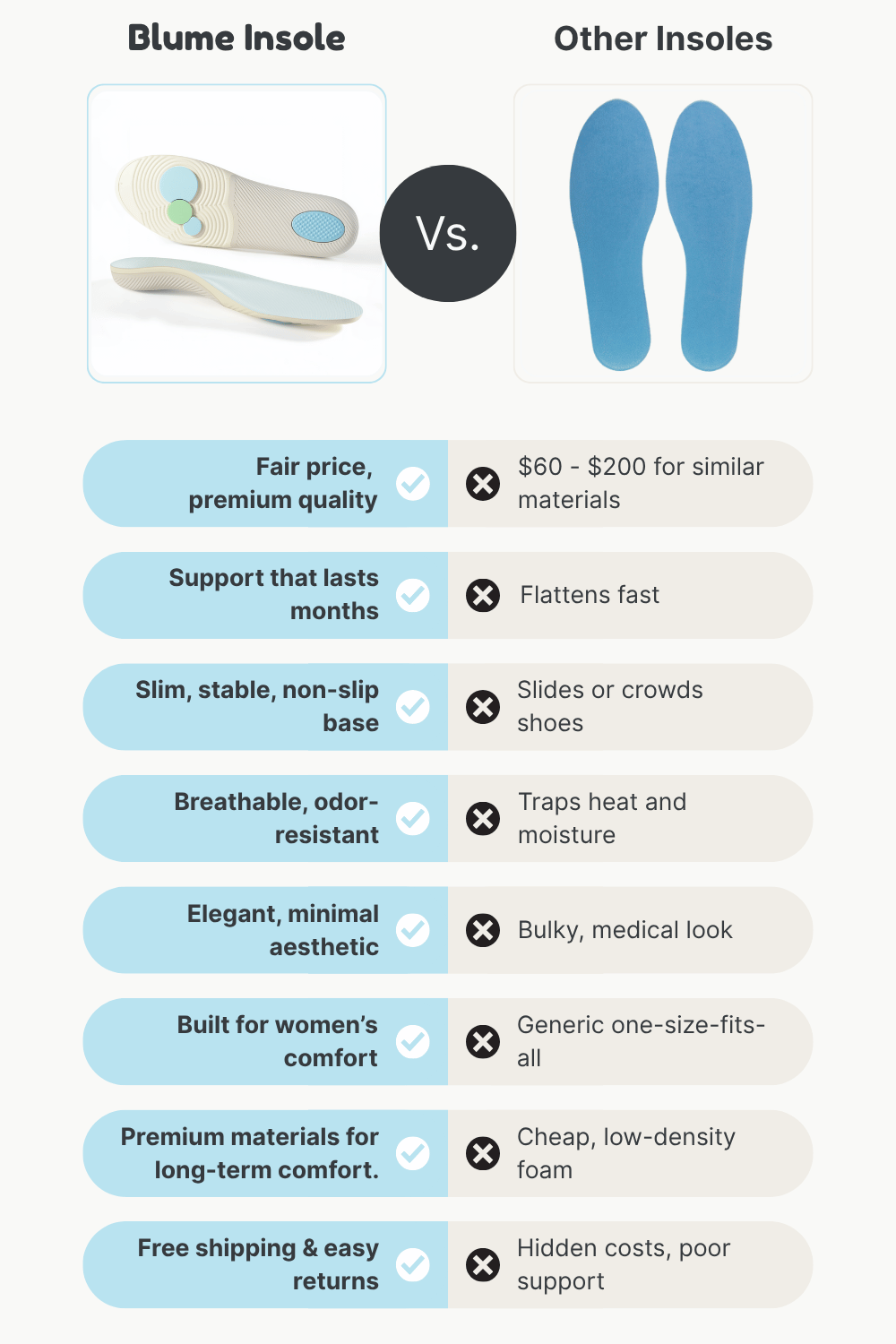 Blume is different. Each contour follows the shape of women’s feet, a narrower heel for alignment, a sculpted arch for balance, and even pressure that keeps every step stable.
